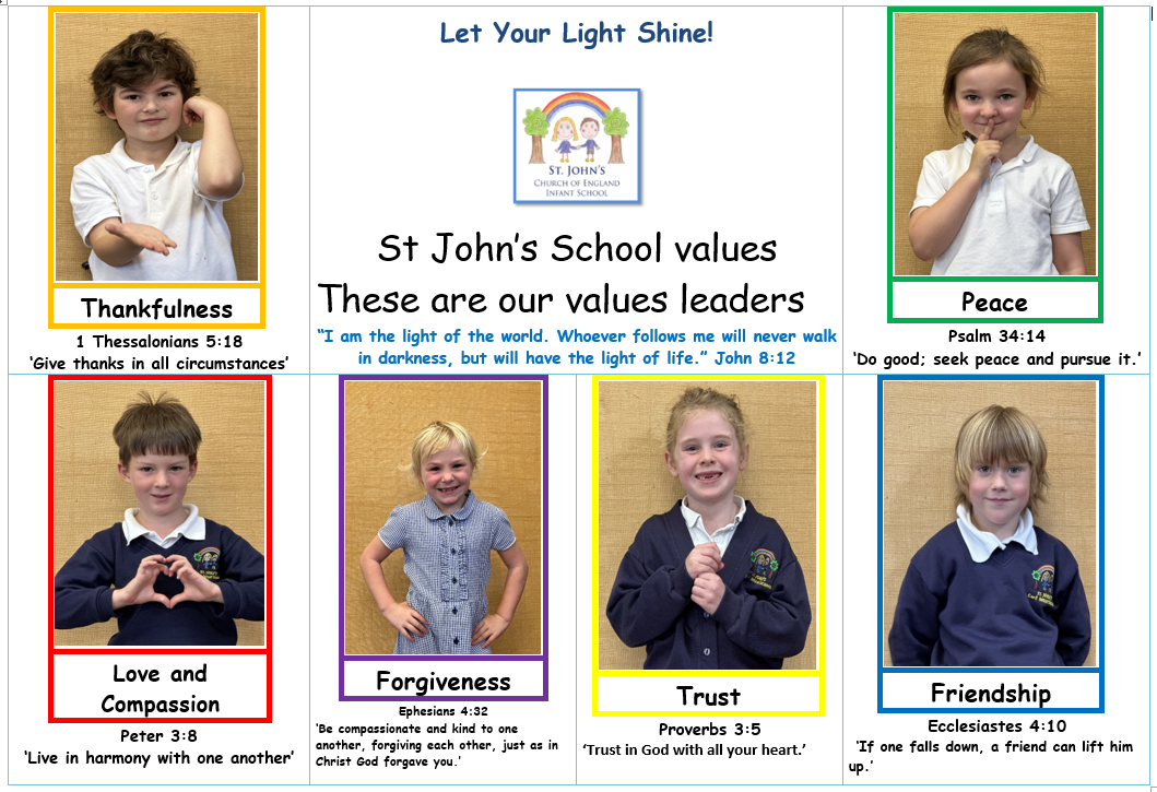 At St John’s CofE Infant School the staff and governors have a responsibility for promoting positive values to help children develop spiritually, morally, socially and culturally - for children of all faiths and those of none. As a CofE school the vision at St John’s is underpinned by Christian values which permeate all areas of school life. Our overarching aim is to deliver, ‘an outstanding education within a caring environment’. Delivering this will help everyone's 'light shine'.