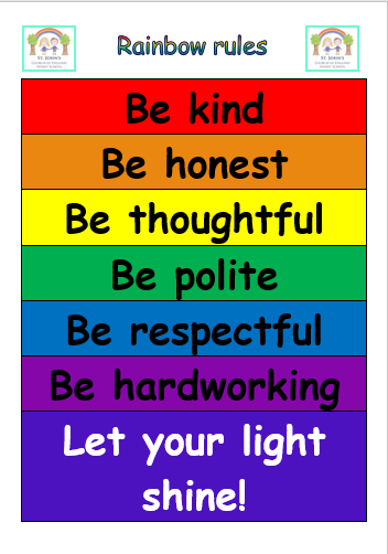 The rules we use to help us live out these values in school and let our light shine are our Rainbow Rules.
